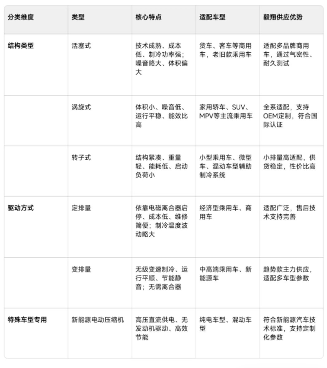 At present, the automotive air conditioning compressors on the market can be mainly divided into two dimensions: structural type and driving mode. Different types of compressors have significant differences in adaptation scenarios and performance characteristics.