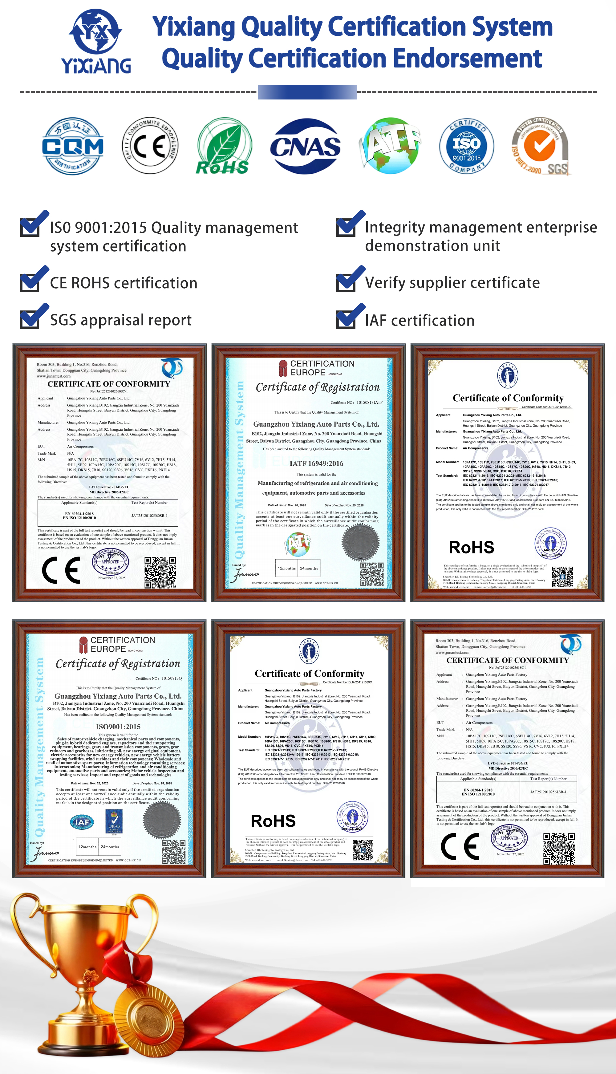 All air conditioning compressors supplied by Yixiang have undergone multiple quality inspection processes, including raw material sampling, performance testing, airtightness testing, and durability testing, and meet international certification standards such as EU CE and North American DOT. We can provide OEM/ODM customization services, match vehicle parameters according to customer needs, and equip a professional technical team to provide free selection consultation and after-sales technical support for global customers.